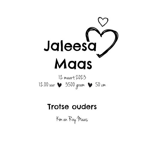 Zwart wit geboortekaartje meisje met hartjes